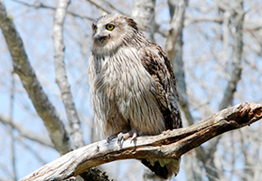 全長70~80cm、体重3~4.5kg、翼を広げると180cmにもなる世界最大級のフクロウです。かつて日本では、北海道全域に1,000羽以上が生息していましたが、現在は道東部を中心に約70つがい、160羽が確認されるのみになりました。1971年に国の天然記念物に指定され、環境省のレッドリストで絶滅危惧IA類(CR)に指定されています。