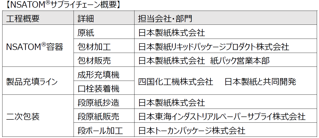 日本製紙株式会社(代表取締役社長:瀬邊明、本社:東京都千代田区、以下「当社」)は、当社が製造販売する固形物・長繊維・高粘度な内容物の充填に対応する、新しいコンセプトの常温保存液体用紙容器「NSATOM®(えぬえすあとむ)」について、一次包装の液体用紙容器から二次包装容器の段ボールまで含めたサプライチェーンに関し、グループ内での供給を可能とする体制を整えました。