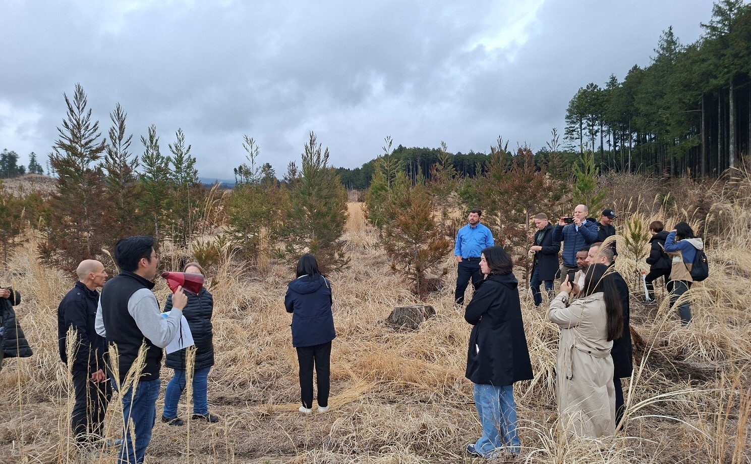 北山社有林では、間伐、皆伐、植林の持続可能な林業経営を紹介するとともに、他国と比較した森林・林業政策の共通点や違い、課題などについても活発な議論がなされました。特に日本の急峻な集水域における森林が果たす防災と水源涵養の働きや、エリートツリーの試験林での既存苗との成長の違いに大きな関心が寄せられ、参加者の皆様の好評のもと無事成功裏に見学を終えることができました。