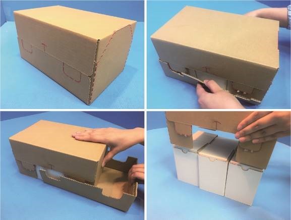 シェルフレディパッケージングにおいて、開封性と耐圧強度の向上を図りました。波型形状の切れ刃を入れることにより簡単、きれいに開封できます。波型形状に工夫をすることで、段積み時、上からの圧が逃げるように工夫しました。また、波型形状の部分を反転させ端を若干ずらしたことにより、横からの衝撃で外装箱が開かない点も特長です。