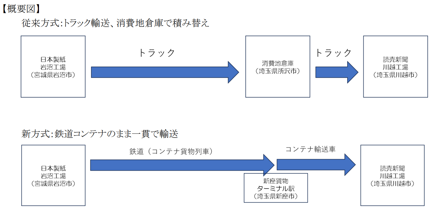 今回の取り組みは、日本製紙岩沼工場で製造した新聞巻取紙を工場内の専用線ホームから鉄道コンテナに積み込んでJR貨物の新座貨物ターミナル駅(埼玉県新座市)まで運び、以降はコンテナ輸送車で読売新聞川越工場へ輸送します。生産工場から納入先までの一連の輸送は、日本製紙の物流子会社である南光運輸が手配します。9月3日から試験運用を開始しており、隣地に建設中の川越新工場が稼働する2026年1月から本格運用します。