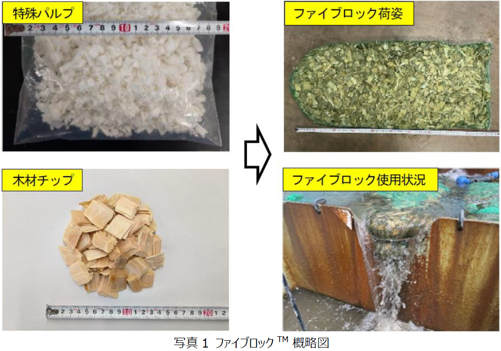 日本製紙株式会社(本社:東京都千代田区、代表取締役社長:瀬邊 明)と戸田建設株式会社(本社:東京都中央区、代表取締役社長:大谷 清介)は、天然由来の植物を主原料とする特殊パルプ(日本製紙開発の「ミネルパⓇ」※1など)と木材チップを混合し、メッシュネットで梱包した、工事濁水中の浮遊物質を捕集するフィルター「ファイブロックTM」※2を開発しました。この度、同技術に対する現場実証を戸田建設の施工現場で行い、従来品と比較して浮遊物質(SS:Suspended Solids)の処理量及び効果の持続性向上を含むその有効性を確認しました。