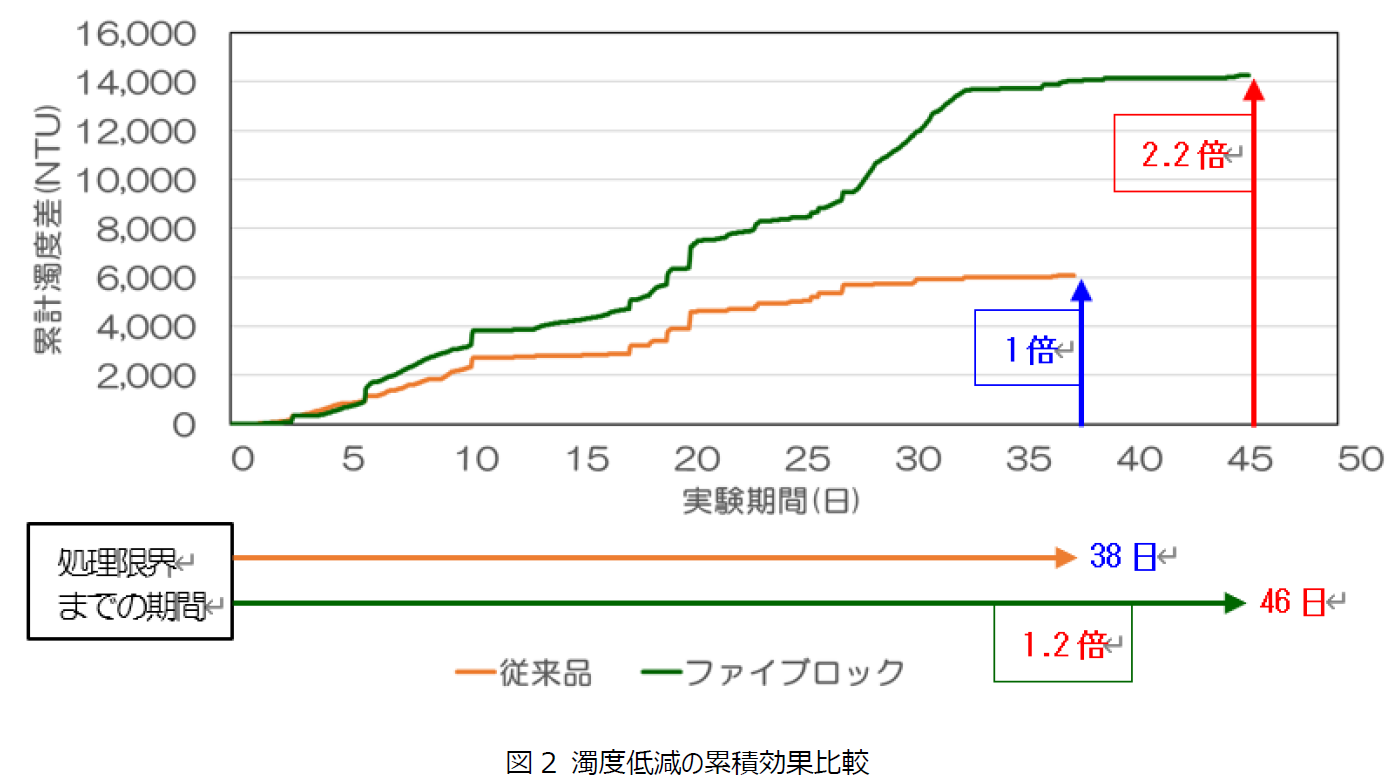 - 2.処理能力が限界になるまでの期間は従来品が38日であったのに対し、ファイブロックが46日で、本実証の条件でファイブロックの効果持続期間は約1.2倍と確認できました。