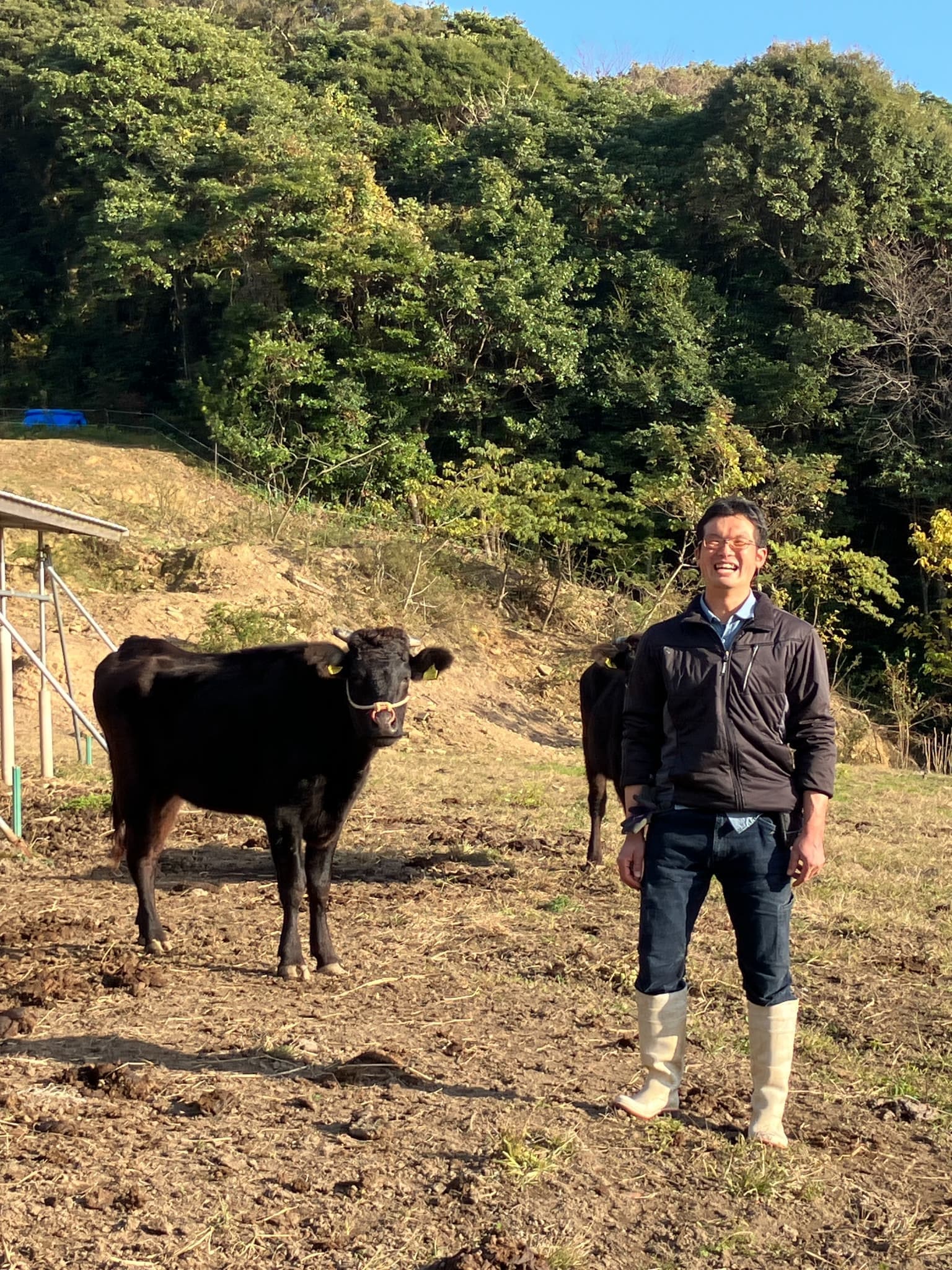 私は天草市の苓明高校(現・拓心高校)の園芸科学科、熊本県立農業大学校で学び、菊池郡の帆保畜産・球磨郡の有田牧場で経験を積んで天草に戻ってきました。経営者になりたいと思っていましたので7年前に離農農家から母牛5頭、子牛1頭を買い取り、中古牛舎を借り上げスタートしました。肥育は人手と設備が必要だろうと思っていましたし、天草は黒毛和牛の繁殖が多い地域なので始めやすかったというのもあります。令和3年には補助事業を活用して新牛舎を建設し、母牛を増やしました。昨年褐毛和種(あか牛)を5頭増やし、現在は母牛50頭です。子牛はだいたい常時30頭くらいいます。天草では獣医、人工授精師、受精卵移植師の高齢化や数が不足していることがあり、自分で削蹄、人工授精、受精卵移植、妊娠鑑定までやるようになり、少しずつ形になってきました。